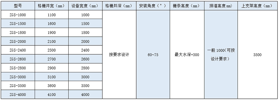 钢丝绳格栅除污机的钢丝绳为不锈钢材料制成。栅条的间隙可按需求在20-100mm范围内选择,井深可按设计要求。
