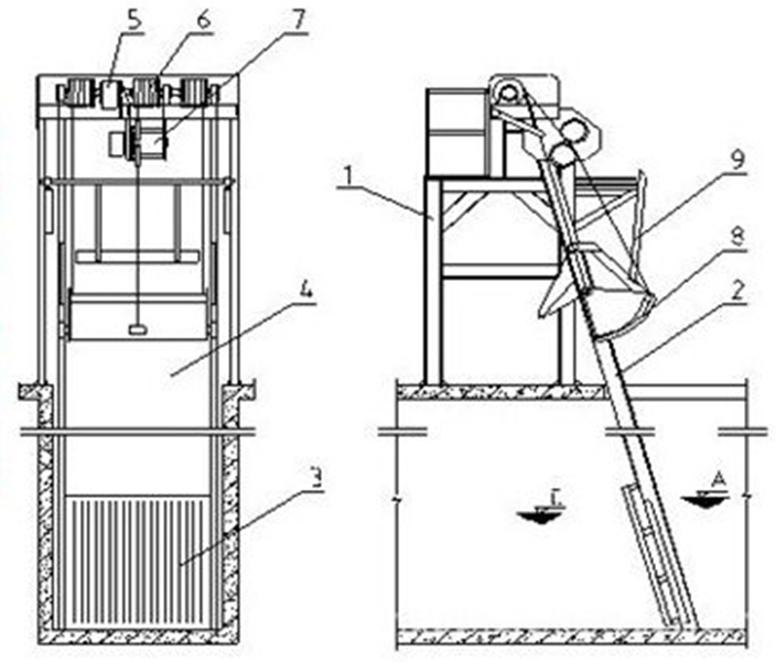 1、机架 2、导轨 3、栅条 4、挡水板 5、卷筒驱动装置 6、钢丝绳卷筒 7、驱动装置 8、除污耙斗 9、撇渣机构