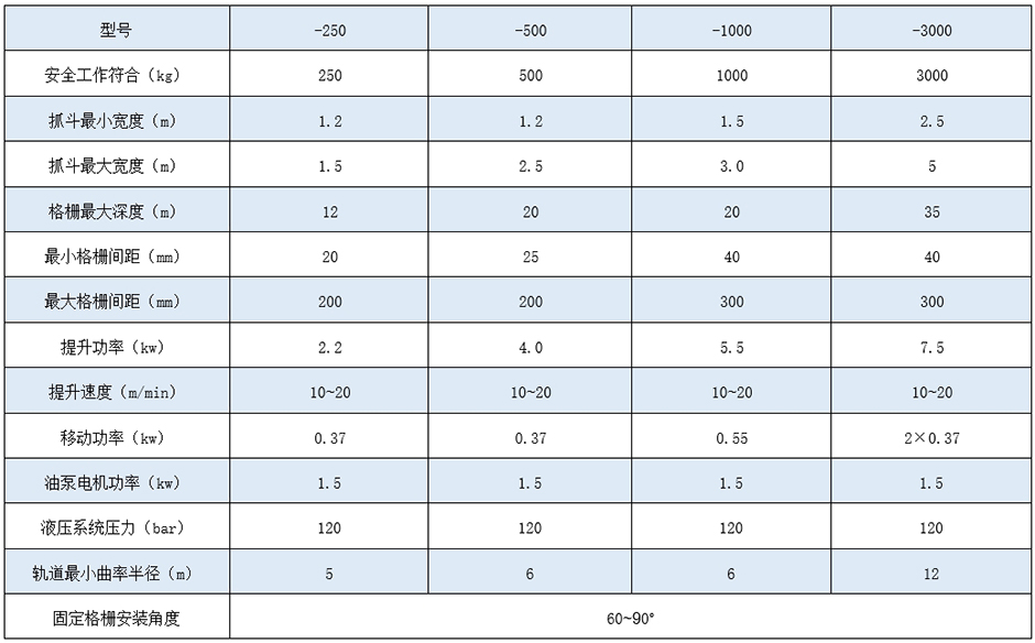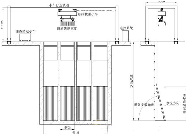 在运转时,小车和耙斗在耙齿开启的情况下,沿着导轨移动至第一工作位,由装在导轨上的感应板感应到开关,而后下车停下,耙斗顶部的栅条一起将堆聚的垃圾推向格栅的底部;到达格栅底部,耙斗停止,耙齿通过液压推杆闭合。而后耙斗和抓聚的垃圾一起上升。当耙斗到达顶部位置,小车就反向运动至卸料位,而后抓斗打开,垃圾进垃圾箱待后续处理。接着,小车和耙斗移动至下一个工作位。在自动方式时,每一个工作位由安装在导轨内的感应板通过PLC选择定位。当所有的工作位都已被清污过,小车返回并停在初始位。