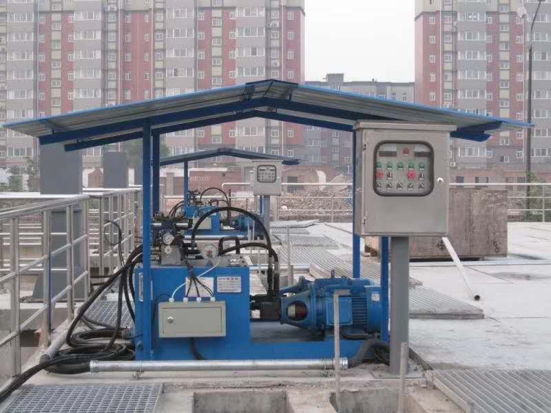 灵活定位——液压装置既可安装在池端便利位置,又可在液压油缸30米范围内定位。这种灵活性更易适应现有沉淀池的改造,而不受池的走道、尺寸等周边因素影响。
