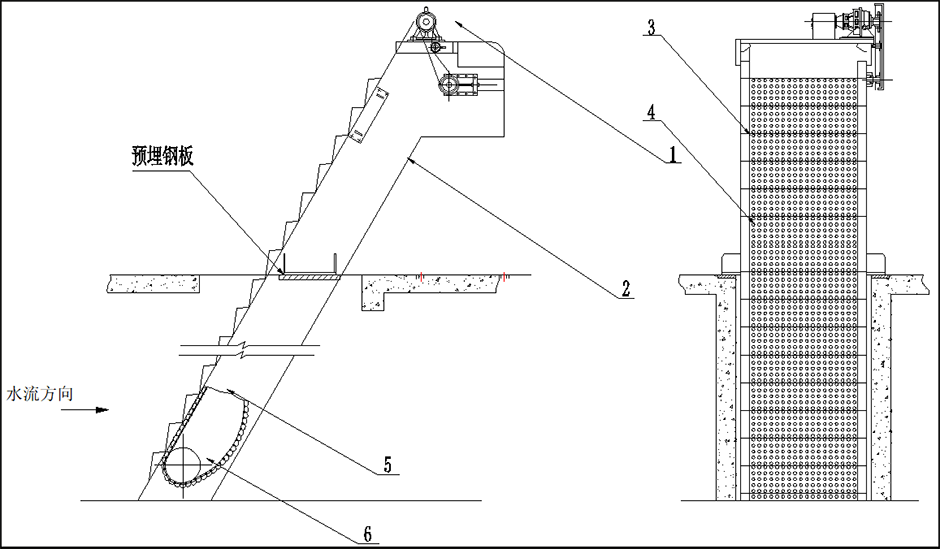 该设备主要由机架、驱动装置、传动链、耙板、清渣装置等组成。设备工作时由驱动装置带动链条循环转动,与链条连接的耙板在作用下将被处理介质的固体杂物分离并提升出来,经清扫装置与重力的双重作用,被彻底清除,最后经由冲洗装置将耙板清洗干净。固体杂物被分离出来,液体则由耙板的孔隙流过,整个过程连续运行。