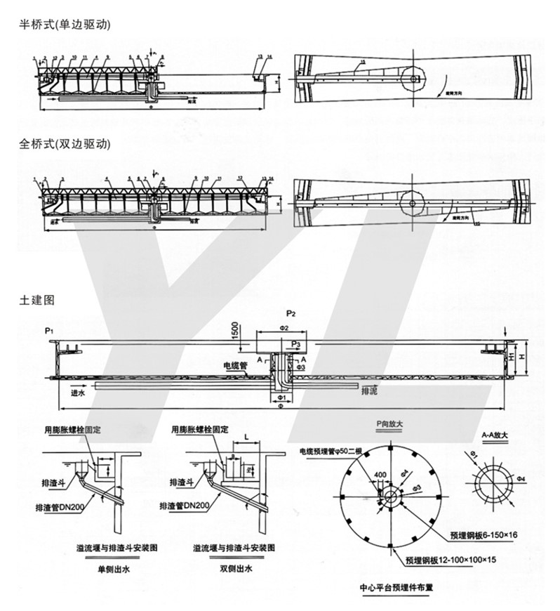 周边传动刮吸泥机适用于中心进水,周边出水,中心排泥的大、中、小型池径的辐流式沉淀池,主要用于城镇污水处理厂或沉淀池内吸排泥。结构及原理