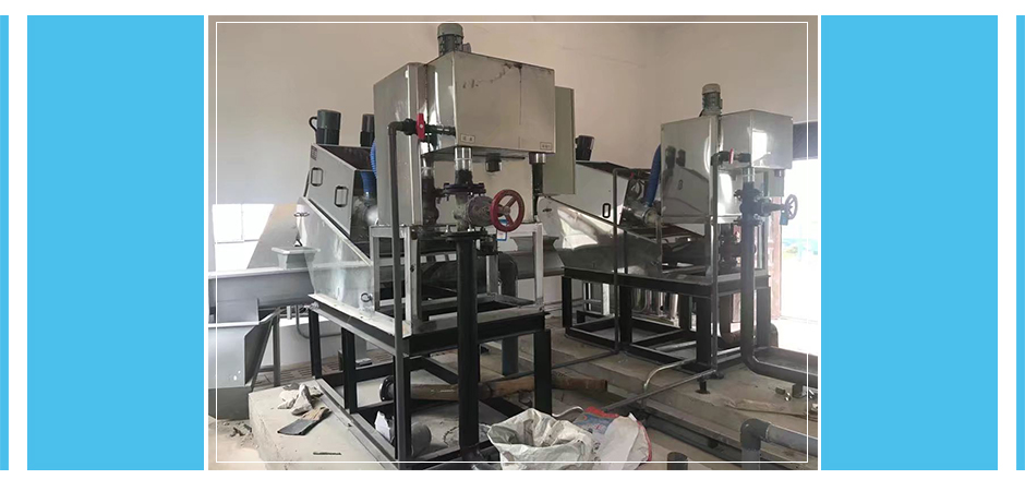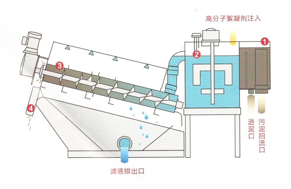 污泥在浓缩部经过重力浓缩后,被运输到脱水部,在前进的过程中随着滤缝及旋距的逐渐变小以及背压板的阻挡作用下,产生极大的内压,容积不断缩小,达到充分脱水的目的。