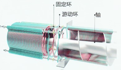 脱水机的旋压主体是由固定环和游动环相互层叠,旋压轴贯穿其中形成的过滤装置。前段为浓缩部,后段为脱水部。固定环和游动环之间形成的滤缝以及旋压轴的旋距从浓缩部到脱水部逐渐变小。旋压轴心的旋转在推动污泥从浓缩部输送到脱水部的同时,也不断带动游动环清扫滤缝,防止堵塞。