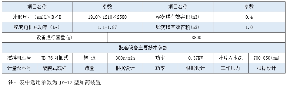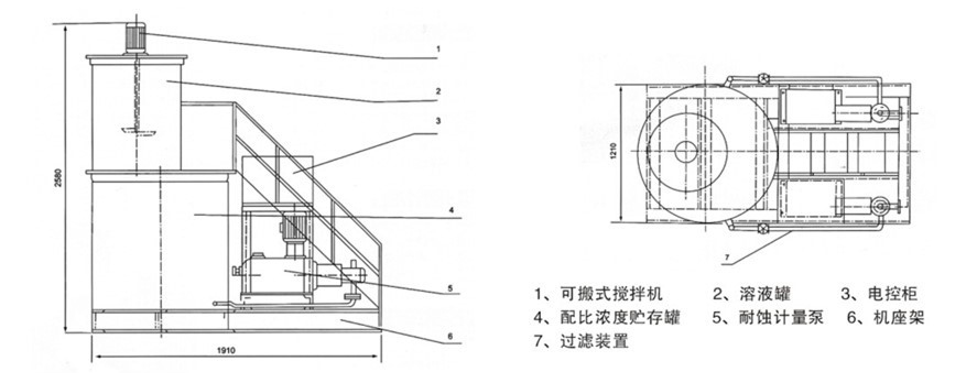 本设备为一体化装置。主要由搅拌机、溶液罐、二级过滤装置、配比浓度药液贮存罐、计量输送泵及电控柜、机座架等部件所组成。根据药液性质采用多种材质及防护层,具有结构紧凑、投药系统不易阻塞、操作管理方便等特点。