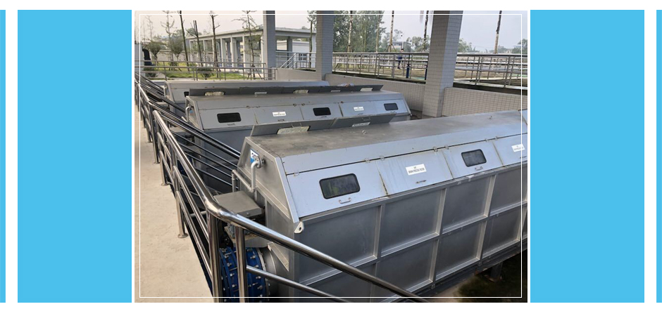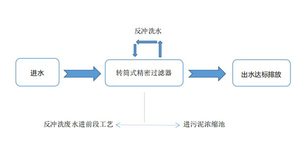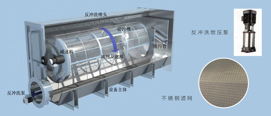 设备为连续过滤,设备内部设有自动启闭开关,当滚筒有水进入时,液位传感器将发出信号,启动减速驱动系统驱动滚筒转动,同时启动反冲洗泵。污水流入空心滚筒内,滚筒上为高强度不锈钢滤网。污水由滤网内侧向外侧流出,污水水中的悬浮物被截留在滤网内侧。冲洗水通过位于滚筒顶部的喷头由滤网外侧向内侧对滤网进行冲洗,冲洗下来的细小颗粒物质由设备内部的反冲洗水收集系统收集,并通过排污管排出设备。当无水通过设备时,设备将自动停止。