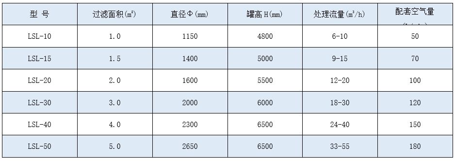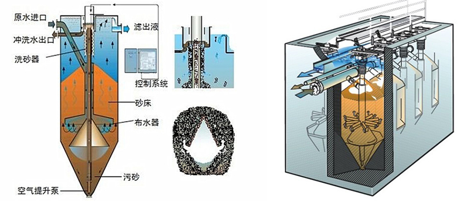 原水经进水管,通过布水管进入过滤器。水流由下向上逆流通过砂床,原水中的杂质被不断截留、吸附,经过滤后的滤液在过滤器顶部聚集,经溢流堰至出水管流出。过滤器底部被污染的滤料通过压缩空气气提装置被提升到过滤器顶部的洗砂器,通过紊流作用使污染物从滤料中分离出来,杂质通过反冲排污管排出,净砂利用自重返回砂床从而实现连续过滤。