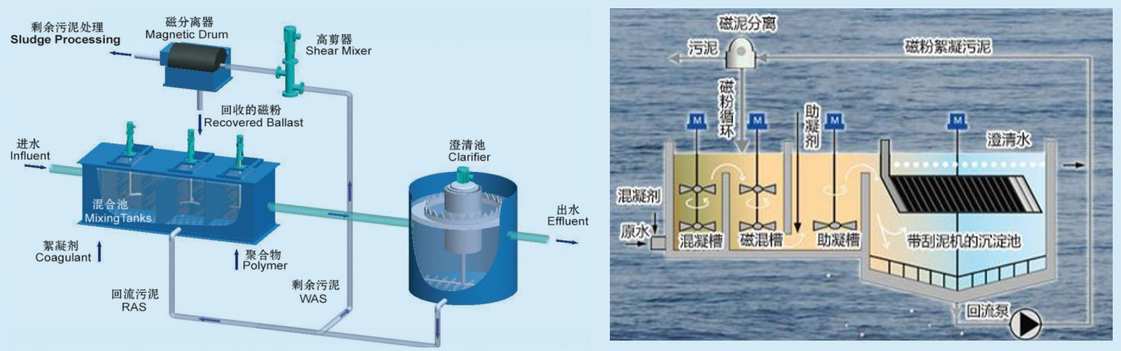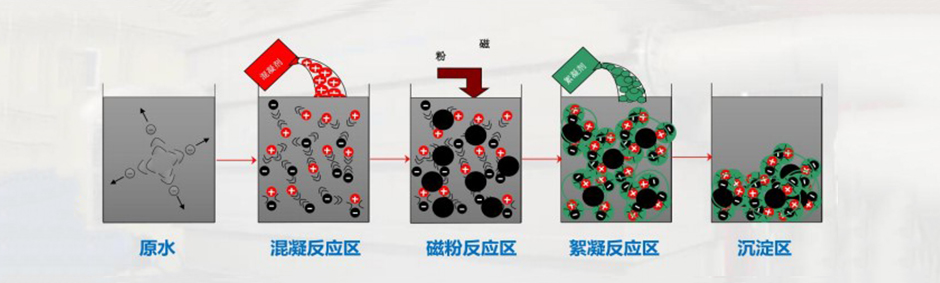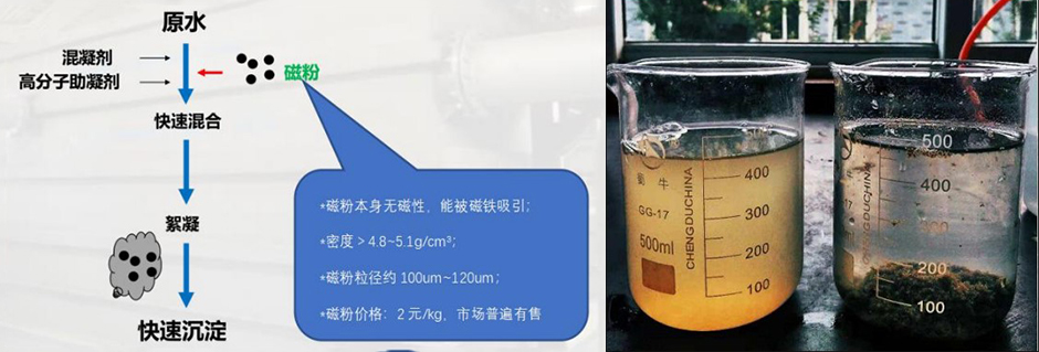 原理2:通过水处理药剂,使污水中非磁性悬浮物与投加的磁粉絮凝成铁磁性重核絮团,快速沉淀,净化水体;磁粉与水污染物分离后循环使用。