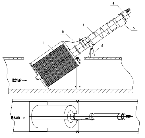该设备采用转鼓螺旋式,由圆形筛筒作为栅面,与水平面成35°安装在水渠中,当污水从格栅端头流入筛筒内,大于栅隙的滤渣被拦截,沉积在筛筒内表面,整个筛筒由电机驱动旋转,筛筒上方的清渣刷与冲水机构对筛面进行清洗,将滤渣冲落入中央物料槽内,由输送螺杆提升,经压榨、脱水后,由卸料口落入物料箱或输送机进行外运处理。